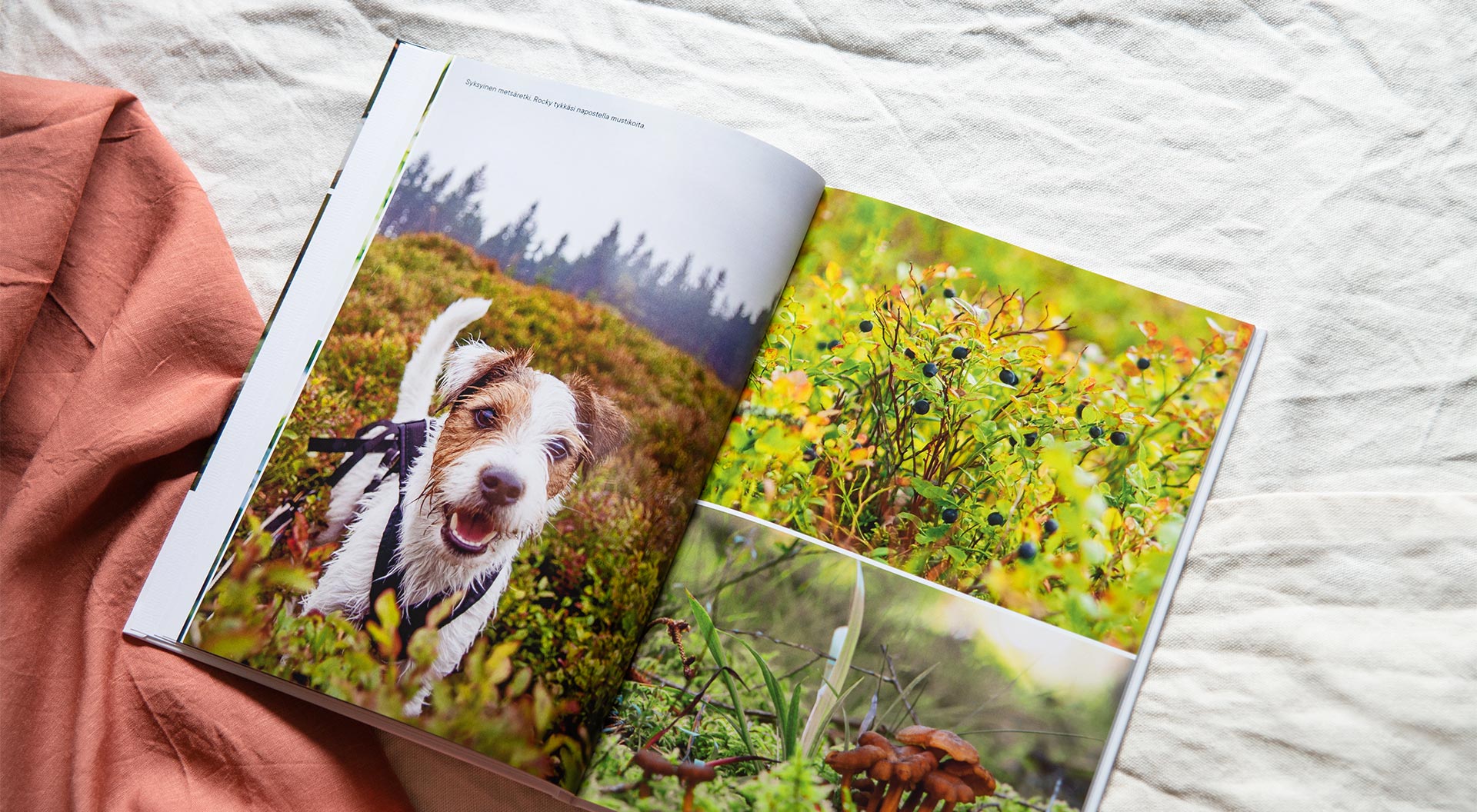 Voit esimerkiksi jakaa kuvat – uudet ja vanhat – eri vuodenaikoihin, jolloin siitä saa kirjaan mielenkiintoisen kulman: millaista on koiran arki meidän perheessämme.